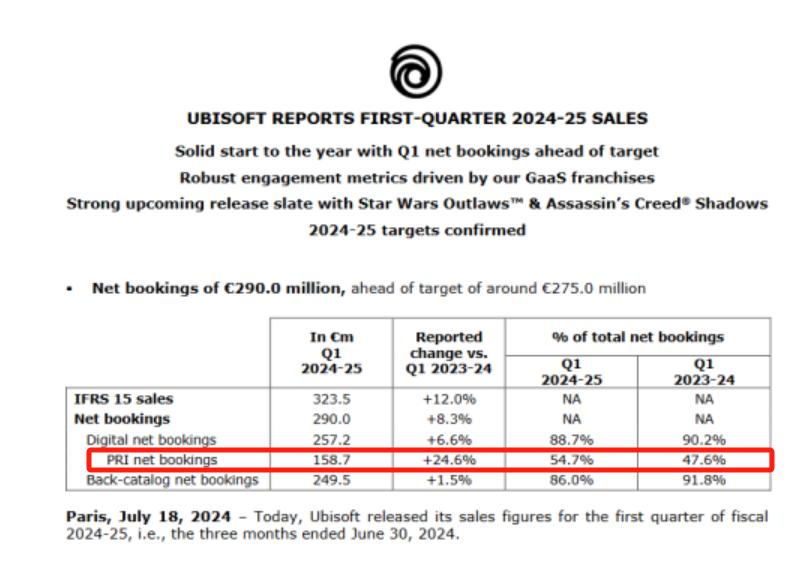 育碧Q1的财报显示,PRI(Player Recurring Investment,包括内购、DLC、季票和订阅等)收入占比达到了54.7%(去年同期47.6%),同时也是最高的增长24.6%。