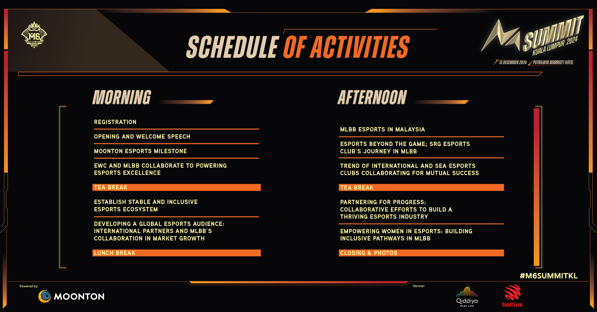 本届M Summit全球电竞峰会将于12月13日在马来西亚首都吉隆坡的布城万豪酒店召开。全球最受欢迎的电竞赛事之一:决胜巅峰MLBB M6世界总决赛也将同期举行,来自16个国家和地区的23支参赛队伍将在此争夺冠军的头衔,瓜分100万美元的奖金池。