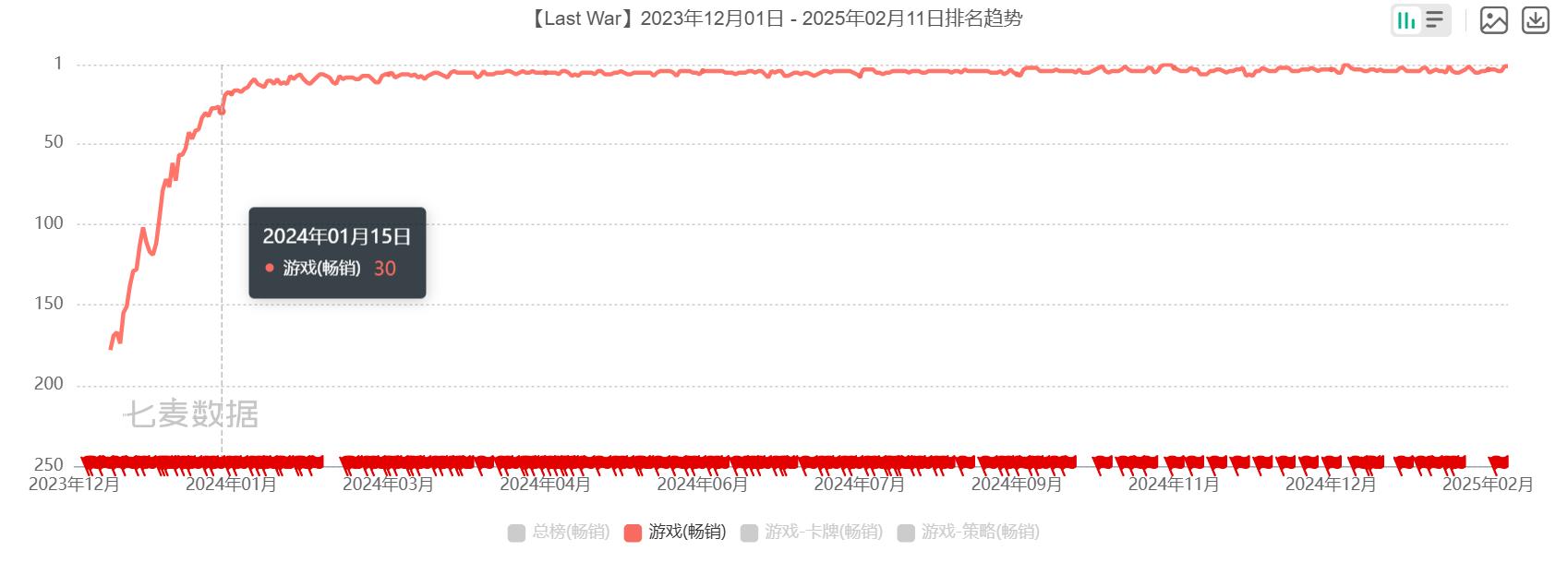 然而这份榜单并没有把其最直接的竞争对手《Last War:Survival》的情况放入其中(可能是因为元趣海外Funfly在新加坡的原因)。同样是Sensor Tower统计,《Last War》在2024年年收入超11亿美元(约80.17亿元人民币),到了2025年1月《Last War》预估流水收入达到了15亿元人民币。
