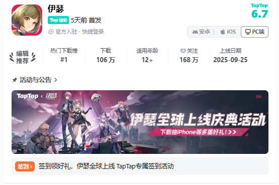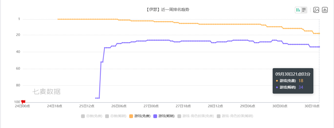 9月25日,心动新游《伊瑟》上线。上线一周后,这款游戏目前IOS游戏畅销榜34,免费榜第18。
