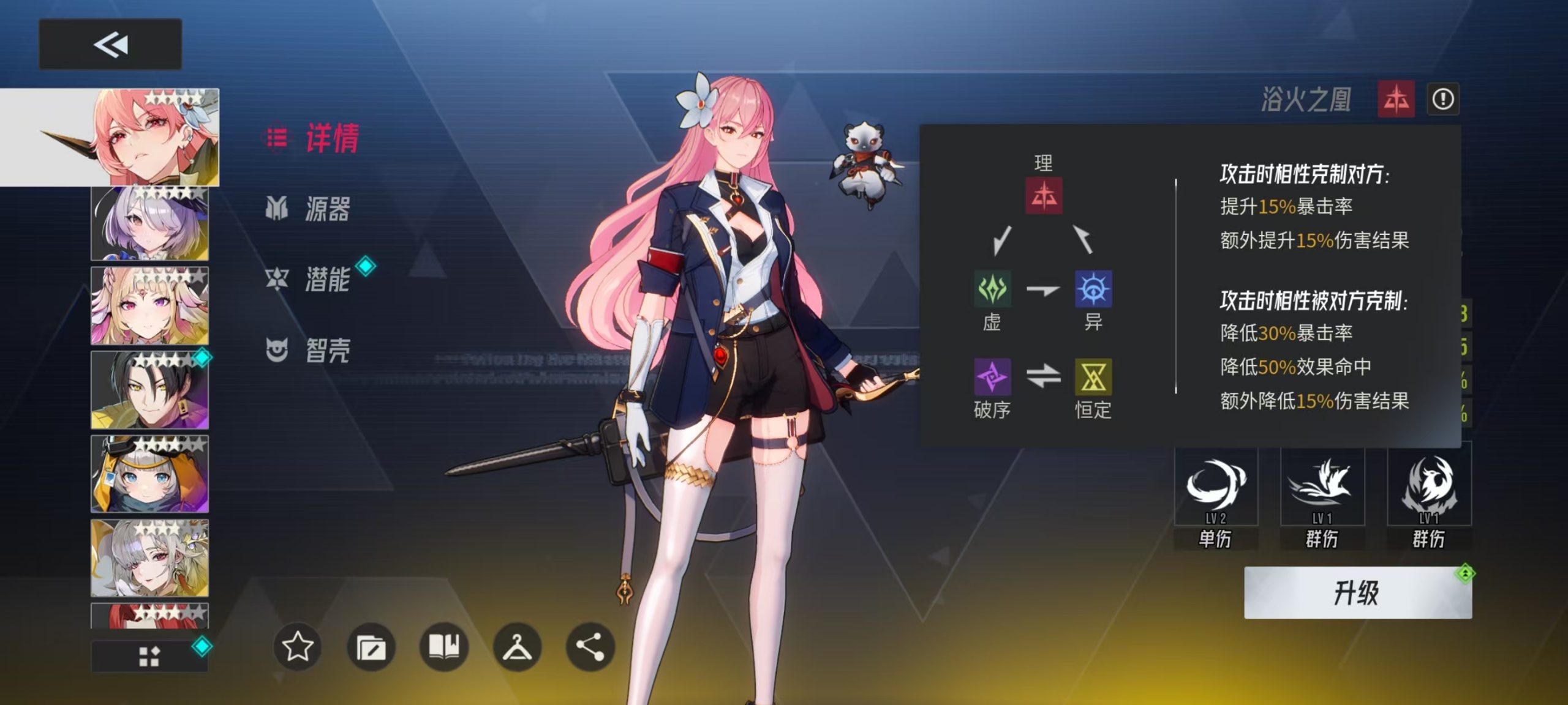 游戏的角色是经典「水、火、草、光、暗」五种属性,其中「水、火、草」循环克制,「光、暗」相互克制。所以在同类型的游戏中,「光、暗」是比较高贵的属性。