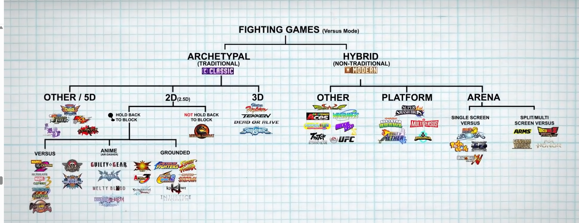 这里参考油管博主Core-A Gaming对FTG的分类,将FTG分为传统格斗游戏和现代格斗游戏。其中传统格斗游戏分为2D、3D和其他,2D即为以《街霸》系列、《罪恶装备》系列为代表的横板格斗,3D则是《VR战士》系列和《铁拳》系列为代表的在2D格斗基础上加入侧向移动的格斗。在传统FTG中,视角通常锁定为侧面视角。