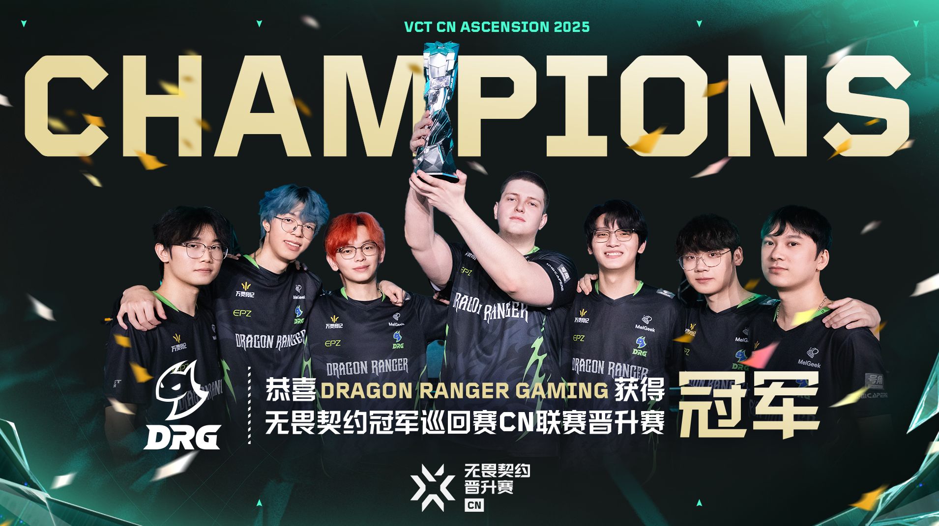 伴随着DRG夺冠,2025无畏契约冠军巡回赛CN联赛晋升赛正式落下帷幕。再度晋级的DRG将开启2026 VCT CN联赛新的征程。正如赛后采访中DRG选手SpiritZ1所说,“VCT CN等着我们回来。”让我们共同期待他们在2026 VCT CN联赛激流勇进取得更好的成绩。在各社交媒体关注@无畏契约电竞,了解无畏契约电竞赛事的最新消息!
