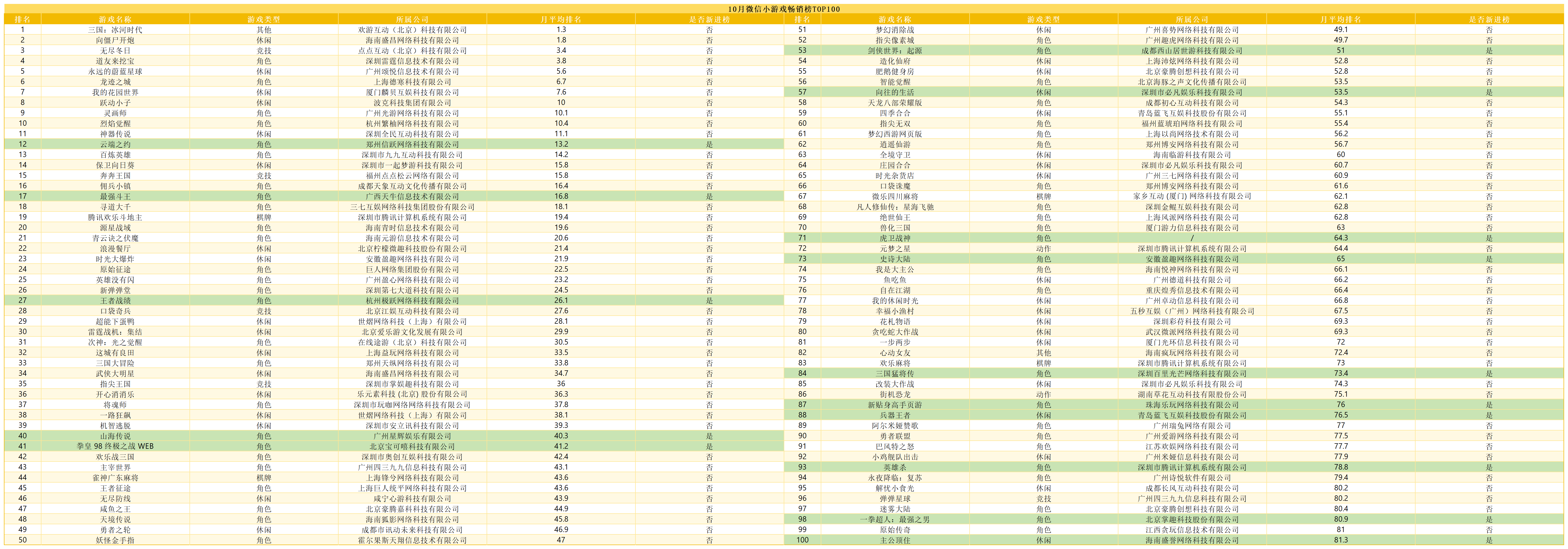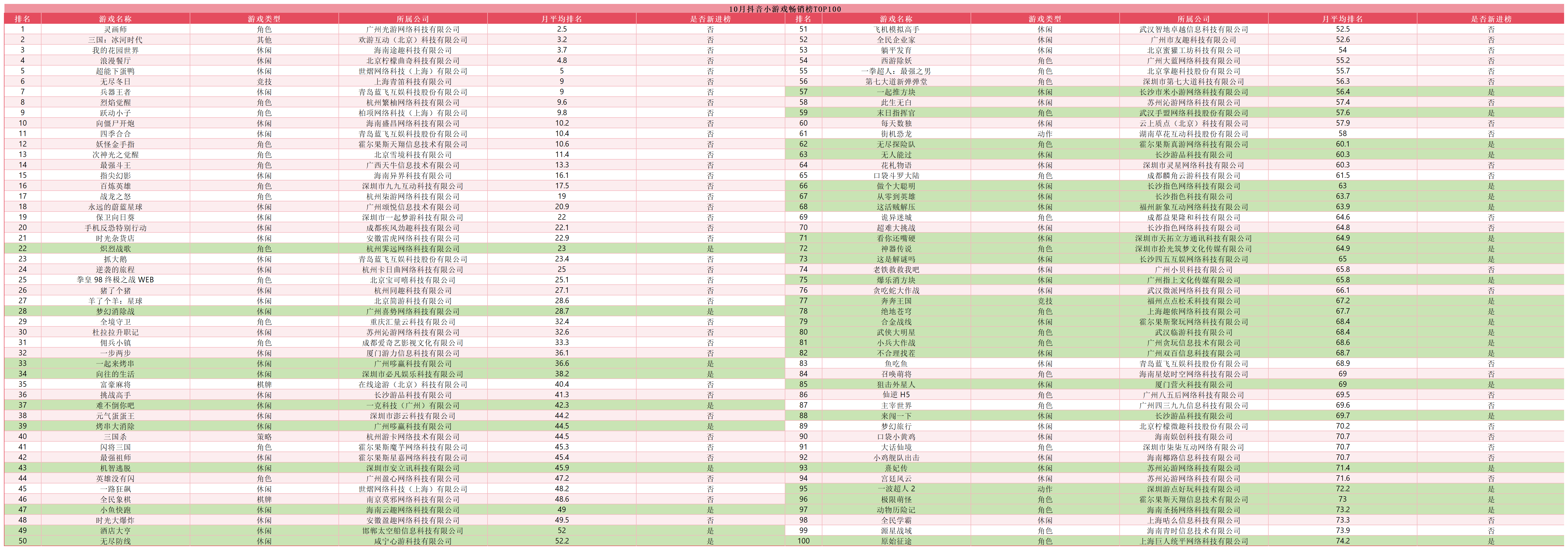 从榜单来看,10月抖音小游戏(重)新入榜的小游戏达到了34款,超过了1/3。而10月微信小游戏(重)新入榜的小游戏只有15款。这说明起步相对较晚的抖音小游戏仍处于比较激烈的「洗牌期」,而微信小游戏则步入相对成熟的「深耕期」。