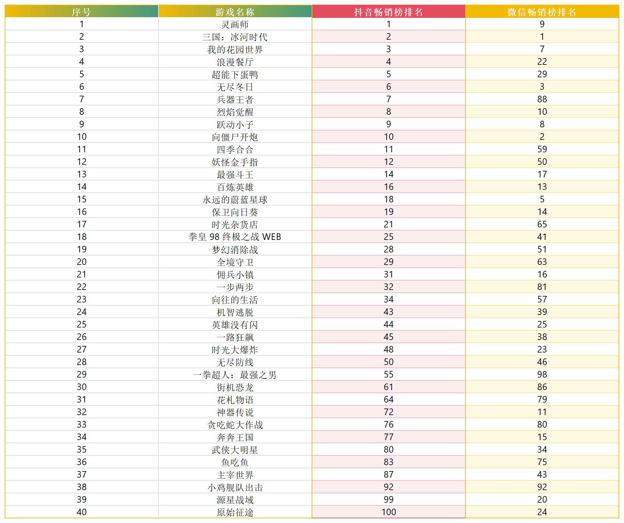 抖音小游戏畅销榜前十:《灵画师》《三国:冰河时代》《我的花园世界》《浪漫餐厅》《超能下蛋鸭》《无尽冬日》《兵器王者》《烈焰觉醒》《跃动小子》《向僵尸开炮》