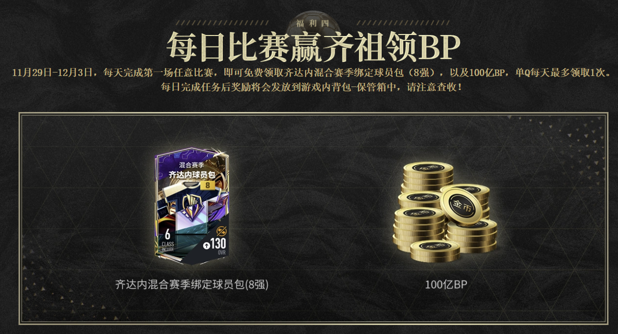 11月29日10:00-12月4日0:00期间,玩家登陆游戏就能免费领取【齐祖回旋赠礼】、【一代宗师转移福利包】,感受核心中场的极致优雅。