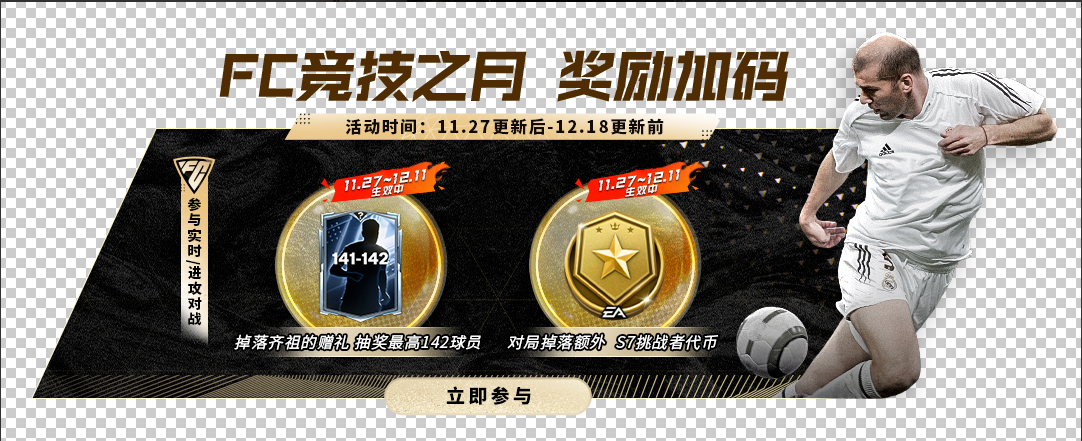 11月27日-12月11日,参与实时对战/进攻对战将能获取额外挑战者代币S7,同时获赠【齐祖的赠礼】道具,勇于参与FC竞技之月活动。