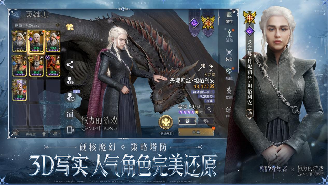 例如,《潮汐守望者》本身就是欧美魔幻题材,其欧美CG画风加上高精度3D建模可以将弑君者·詹姆·兰尼斯特、雄狮之智·提利昂·兰尼斯特、龙之母·丹妮莉丝·坦格利安这些经典IP角色魅力充分展示到游戏中。以沉浸世界观匹配权游史诗感,开辟新叙事空间。